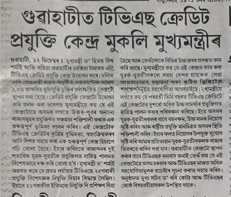 ಸಿಎಂ ಡಾ. ಶರ್ಮಾ ಅವರು ಗುವಾಹಟಿಯಲ್ಲಿ ಟಿವಿಎಸ್ ಕ್ರೆಡಿಟ್ ಟೆಕ್ನಾಲಜಿ ಸೆಂಟರ್ ಅನ್ನು ಉದ್ಘಾಟಿಸಿದರು