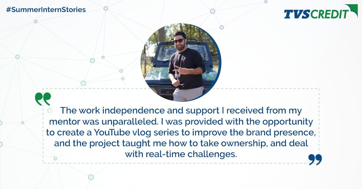 माझ्या इंटर्नशिप कालावधी दरम्यान माझ्या मेंटरद्वारे प्रदान केलेले कामाचे स्वातंत्र्य अतुलनीय होते. त्याच्याद्वारे प्रदान केलेली मजबूत सपोर्ट सिस्टीम आणि टीमने मला समस्यांसाठी संरचित दृष्टीकोन निर्माण करण्यास मदत केली. इंटर्नशिप दरम्यान त्यांचे निरंतर सहाय्य हा अनुभव असामान्य बनवला. टीव्हीएस क्रेडिटमध्ये या समृद्ध आणि मौल्यवान अनुभवावर निर्माण करणे माझे ध्येय आहे.