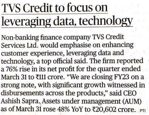 TVS Credit Services registers strong growth in AUM of 42% versus Q1 last year and adds 10 Lakh new customers