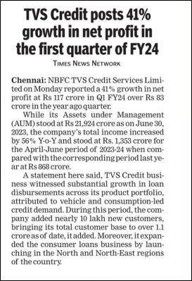 TVS Credit registers a net profit after tax of Rs.252 Crore for H1 FY24 with book growth of 14%