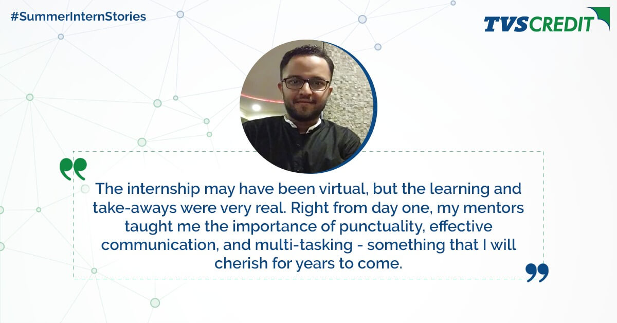 டிவிஎஸ் கிரெடிட் உடன் எனது இன்டர்ன்ஷிப் பயணம் என்பிஎஃப்சி துறை முழுவதையும் பற்றி தெரிந்துகொள்ள எனக்கு உதவியது. இந்தத் துறையில் உள்ள தலைவர்களின் வேலைகள் பற்றி ஒரு கண்ணோட்டத்தை கொண்டிருப்பது உணர்ச்சிபூர்வமாக இருந்தது. தனிப்பட்ட முறையில் வேலை, நேர மேலாண்மை மற்றும் உற்பத்தித்திறன் ஆகியவற்றைப் பற்றிய எனது கண்ணோட்டம் மிகப்பெரிய அளவில் அதிகரித்தது. மற்றும் அனைத்திலும் மிக முக்கியமானது, எனது யோசனைகளை எவ்வாறு திறம்பட செயல்படுத்துவது என்பதை நான் கற்றுக்கொண்டேன்.