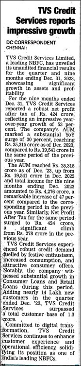 டிவிஎஸ் கிரெடிட் சர்வீசஸ் சிறப்பான வளர்ச்சியைப் பதிவு செய்துள்ளது