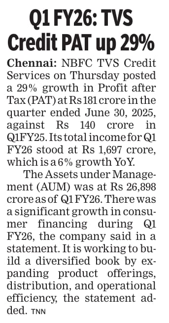 క్యు1 ఎఫ్వై26: టివిఎస్ క్రెడిట్ పిఎటి 29% పెరిగింది